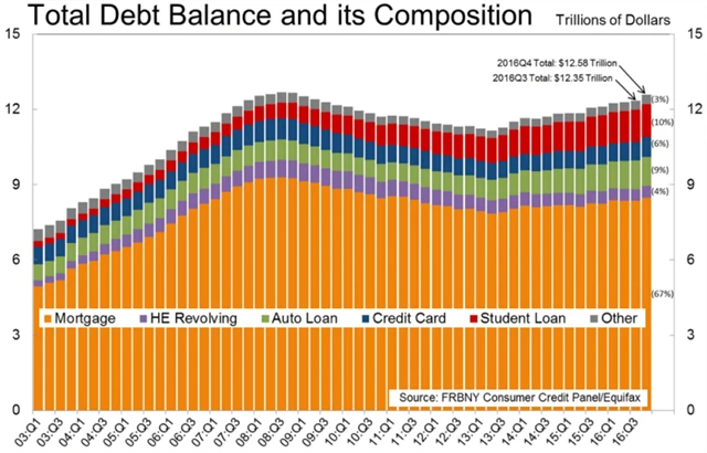 Zadlužení amerických domácností ke konci roku 2016 dosáhlo celkového objemu 12,58 bilionu USD. Jen za čtvrtý kvartál tak narostlo o 1,8 % (226 miliard USD) a pohybovalo se jen 0,8 % pod svým rekordem ze třetího čtvrtletí 2008.