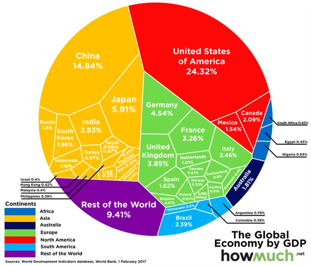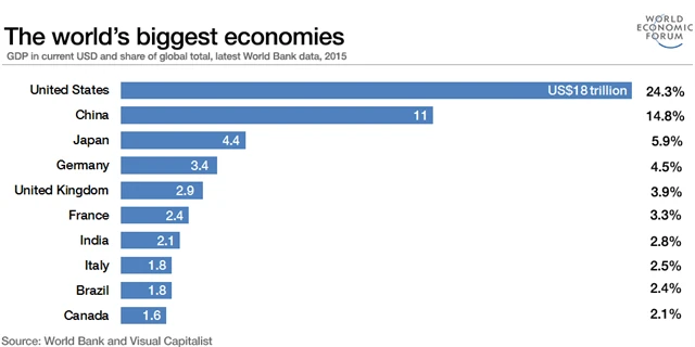 Ekonomika Spojených států amerických se na světovém HDP podílí v současnosti bezmála čtvrtinou, Čína je druhá s necelými 15 % a třetí se drží Japonsko se zhruba 6 %. Za nimi následuje tradiční západoevropská trojka, tedy Německo, Spojené království a Francie. Před osmou Itálii se již stihla vklínit Indie, desítku doplňují Brazílie a Kanada.
