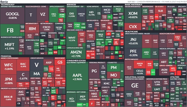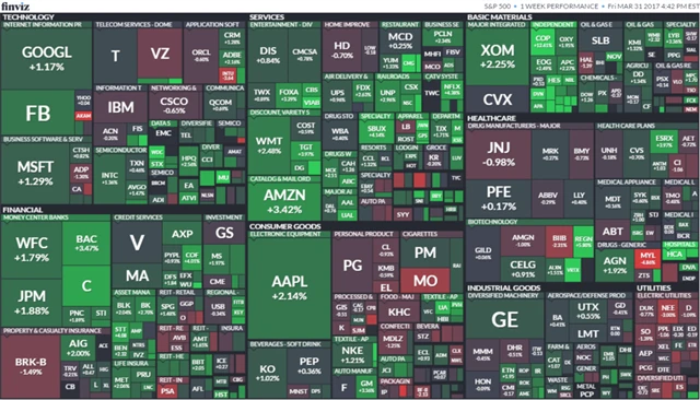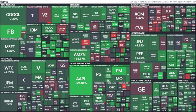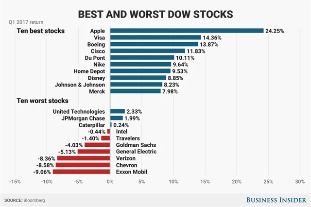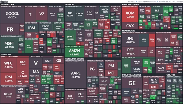 Nejhůře si v pátek vedly energetické a finanční společnosti v čele s firmami ExxonMobil (-2,02 %) a JPMorgan Chase (-1,34 %). Index Dow v pátek 31. března uzavřel slabší o 0,31 % na 20 663,22 bodu (na konci roku 2016 19 762,60 bodu, na konci února 2017 20 812,24 bodu, 24. března 2017 20 596,72 bodu), S&P 500 v pátek ztratil 0,23 % na 2 362,71 bodu (2 238,83 bodu, 2 363,64 bodu, 2 343,98 bodu) a Nasdaq Composite odepsal v poslední březnový den 0,04 % na 5 911,74 bodu (5 383,12 bodu, 5 825,44 bodu, 5 828,74 bodu).
