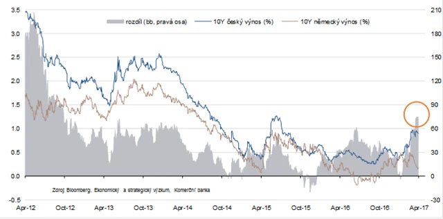 Naopak výnosy německých dluhopisů v posledních týdnech prudce poklesly kvůli nervozitě spojené s volbami ve Francii, geopolitickému napětí v souvislosti se situací v Sýrii a na Korejském poloostrově a kvůli zklamání trhů z Trumpovy domácí politiky.