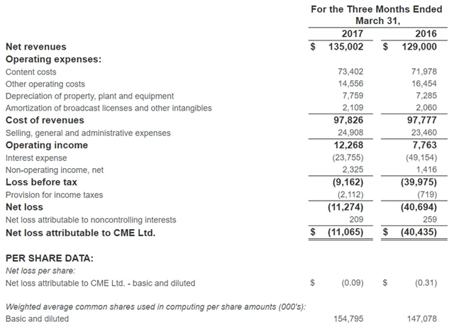 Tržby se CME v prvním letošním čtvrtletí zvýšily meziročně o 4,7 % na 135 milionů USD (bez vlivu změn kurzů měn +8,1 %), provozní zisk OIBDA společnosti vyskočil o 29,4 % na 22,14 milionu USD (bez FX +35,2 %) a OIBDA marže stoupla z 13,3 % na 16,4 %.