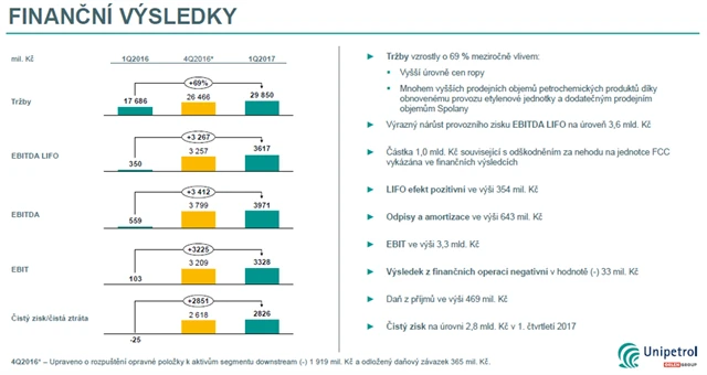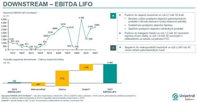 Unipetrol - zisk EBITDA LIFO v segmentu downstream (1Q2017)