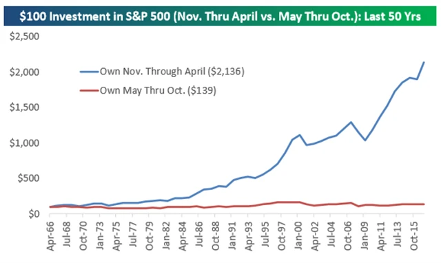 S&P 500 - průměr zhodnocení 100 USD od května do října vs. od listopadu do dubna | zdroj: Bespoke Investment Group