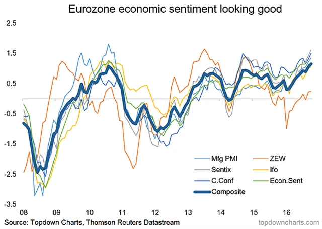 V eurozóně je obrázek opravdu nadějný. V době po krizi ještě nebyl indikátor složený ze šesti uvedených indexů výše.