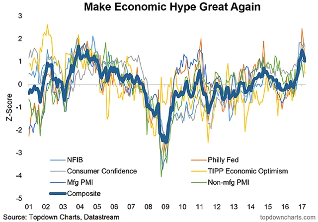 Ani v USA není situace špatná, zdá se ale, že očekávání spojená s nástupem Donalda Trumpa a jeho administrativy byla přece jen přehnaná. I proto je na konci grafu patrná tendence ke změně trendu.