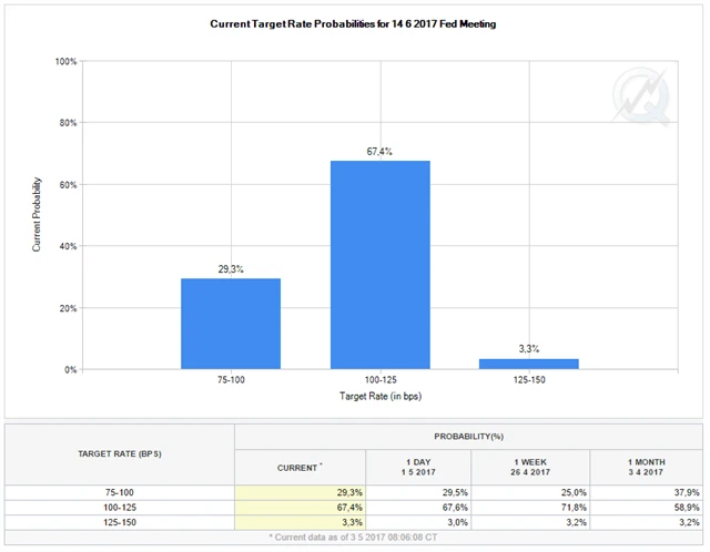Šance na květnové zvýšení sazeb dosahovaly podle dat burzovní skupiny CME jen asi 5 %. Šance na zvýšení sazeb na červnovém zasedání výboru naproti tomu dosahují více než 70 %.