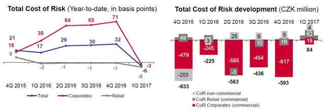 Provozní zisk bez mimořádných položek (před započtením nákladů na rizika) se bance zvýšil o 1,7 % na 7,82 miliardy Kč. Náklady na rizika byly zanedbatelné, banka rozpustila opravné položky ve výši 84 milionů Kč, což podle ní odráží příznivé makroekonomické prostředí a úspěšnost vymáhání. Podíl nesplácených úvěrů klesl na 2,4 % z 2,5 % na konci loňského roku.
