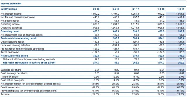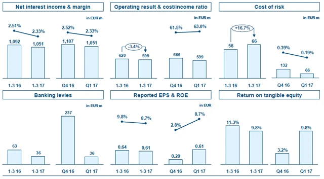 Na úrovni provozního zisku tak banka vykázala výsledek 599,2 milionu eur po 620,5 milionu eur v prvních třech měsících roku 2016. Náklady na rizika se bance mírně zvýšily z 56,4 milionu eur na 65,8 milionu eur.