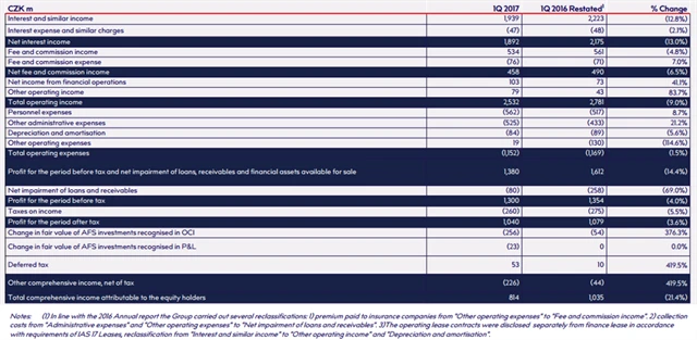 "Stejně jako v předchozích kvartálech pokračoval tlak na úrokové marže a výnosy a tlak na výnosy z poplatků. Devítiprocentní nárůst personálních nákladů (růst mezd a počtu zaměstnanců) byl více než kompenzován 10% poklesem ostatních administrativních nákladů, kde se projevily mimo jiné úspory pramenící z oddělení společnosti od GE Capital (47 milionů eur) a rozpuštění rezerv na právní služby (84 milionů korun)," napsal analytik z J&T Banky Milan Lávička. "Výsledky hodnotíme pozitivně a očekáváme pozitivní reakci ceny akcií," dodal Milan Lávička.
