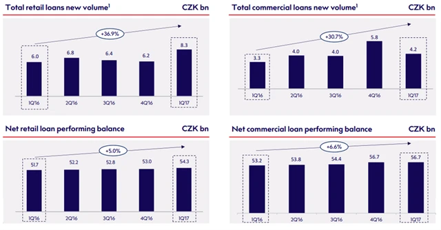 Objem nových úvěrů dosáhl v prvním čtvrtletí v retailovém segmentu 8,28 miliardy Kč (1Q2016: 6,05 miliardy Kč, 4Q2016: 6,16 miliardy Kč) a v korporátním segmentu 4,25 miliardy Kč (1Q2016: 3,25 miliardy Kč, 4Q2016: 5,79 miliardy Kč).
