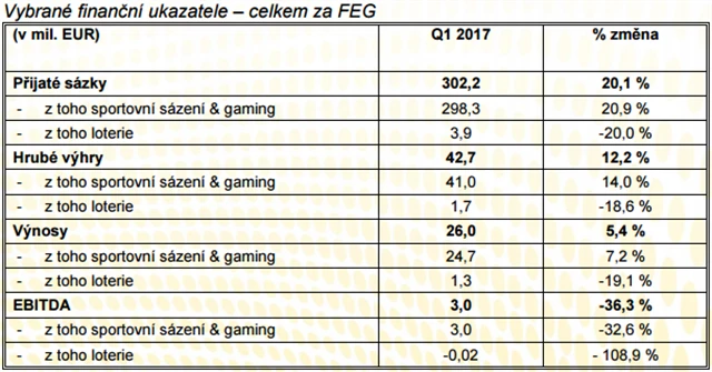 Hrubé výhry v prvním čtvrtletí 2017 činily 42,7 milionu EUR, což je nárůst o 12,2 % ve srovnání s prvním čtvrtletím loňského roku. Meziroční nárůst byl primárně ovlivněn sázením on-line, které znamená nižší marži hrubých výher než u sázení na pobočkách.
