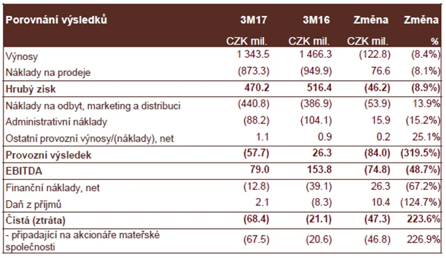 Kofola ČeskoSlovensko - hospodářské výsledky za 1Q2017