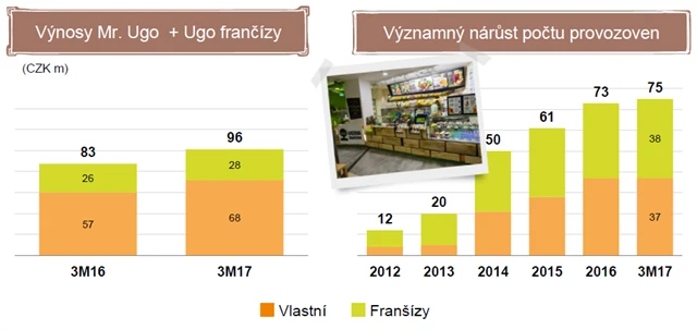 Velmi dobře opět vyzněly výsledky fresh barů a salaterií UGO. Tržby v tomto segmentu, včetně prodeje produktů UGO mimo stejnojmenné provozovny, stouply v prvním čtvrtletí meziročně na 96 milionů korun z 83 milionů korun. Na trhu přibyly od konce prosince dvě nové franšízové provozovny UGO.
