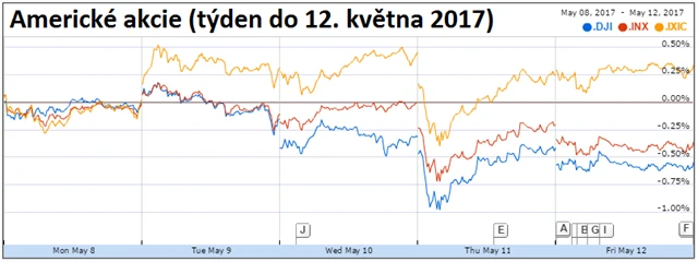 Na Wall Street v týdnu převládala negativní nálada kvůli nečekanému rozhodnutí amerického prezidenta Donalda Trumpa odvolat ředitele Federálního úřadu pro vyšetřování (FBI) Jamese Comeyho. Zpráva vyvolala obavy, zda nejnovější krize nezpozdí zavedení prorůstových plánů, jako jsou snížení daní nebo zvýšení výdajů na infrastrukturu.