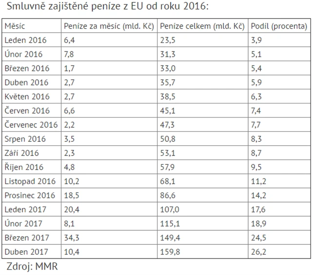 "Jsou to peníze, které ještě příjemce nemusí fyzicky mít. Ale už má v ruce doklad, že je dostane," uvedla náměstkyně MMR Olga Letáčková. V dubnu přibylo do smluvně zajištěných peněz 10,4 miliardy korun. Vůbec nejúspěšnější byl březen s částkou 34,3 miliardy korun. Od začátku roku Česko vyčerpalo 73,2 miliardy, což je více než za celý rok 2016.