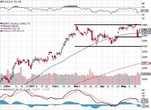 "Po více než dvou měsících vývoje do strany pod rezistencí na 2 400 uzavřel index S&P 500 v pondělí nad touto úrovní. Dlouho očekávaná událost ale neměla pokračování a index nakonec za týden odepsal 0,38 %. Středeční propad o zhruba 1,8 % byl po řadě měsíců relativního klidu malým šokem. Řešila se politika a prezident Donald Trump. Čtvrtek a pátek ale přinesly uklidnění. Ve středu, ale hlavně ve čtvrtek i v pátek byl objem obchodů nadprůměrný. Kupci se rychle vrátili na trh a využili nižších cen. Ekonomické fundamenty a hospodářské výsledky firem jsou přece jen spíše na jejich straně. Na denním grafu se navzdory netradičně divokému týdnu stále nic nemění. Index je v širším rozpětí 2 320 až 2 400. Díky rychlému propadu se zaplnily cenové odskoky z konce dubna, ale trh je stále na stejné hladině jako poslední tři měsíce," napsal v pravidelném technickém komentáři pro Investiční web opční obchodník Josef Košťál. "Graf indexu S&P 500 je v neutrálním nastavení. Květen zatím potvrzuje pověst volatilního měsíce, ale to je vše. S&P 500 je v širším rozpětí 2 320 až 2 400. Vrátí se brzy nad 2 400?"
