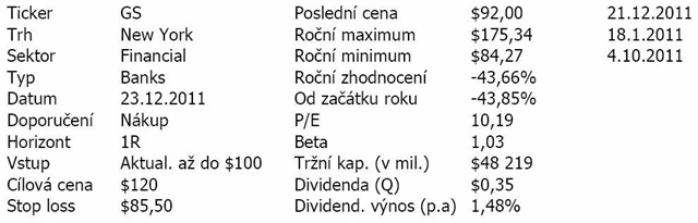 Společnost Goldman Sachs je světová investiční banka poskytující klientům širokou škálu bankovní služeb. Operuje ve třech hlavních segmentech: investiční bankovnictví, služby institucionálním klientům a management investic a úvěrů. Tradiční autor investičních doporučení se ovšem sám na burze pohybuje na úrovních, které mohou znamenat dlouhodobou nákupní příležitost.