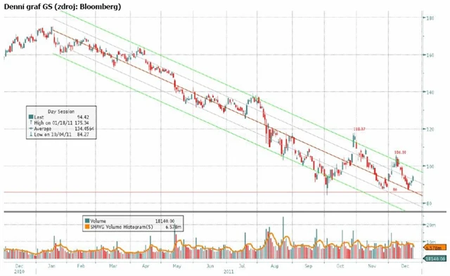 Akcie banky Goldman Sachs vykazují pevný support 86 USD. Pokud by úroveň 86 uchránila kurz před poklesem, tak by se mohlo jednat o velmi zajímavou nákupní příležitost s delším horizontem. Kurz by mohl narážet na rezistenci na hranici trendového kanálu, ale po trojnásobném testování podpory a podle stáří klesajícího trendu je pravděpodobnější prolomení trendu směrem vzhůru.