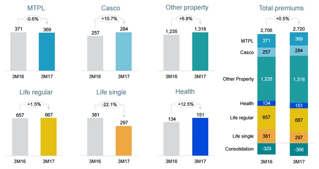 Bez započtení segmentu jednorázového životního pojištění se celkový objem hrubého předepsaného pojistného VIG zvýšil meziročně o 4,2 %. Objem hrubého předepsaného pojistného v segmentu jednorázového životního pojištění klesl na 297 milionů eur z 381 milionů eur.