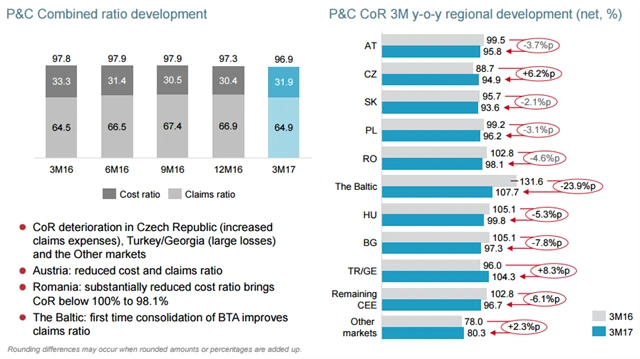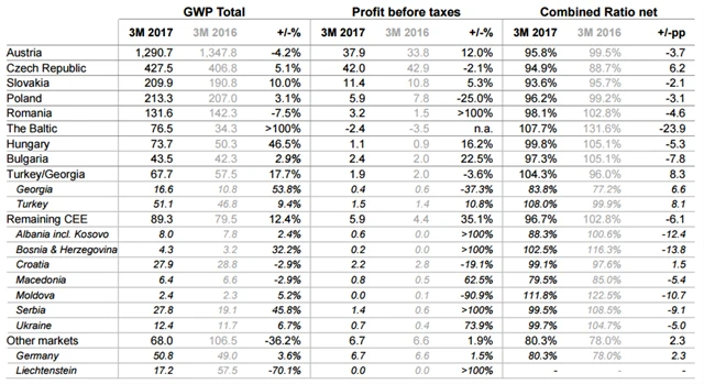 V ČR kombinovaný poměr meziročně vyskočil na 94,9 % z 88,7 %, tento nárůst byl ovšem kompenzován poklesem ukazatele na prakticky všech ostatních trzích. Nejvýrazněji se kombinovaný poměr snížil na pobaltských trzích, a to na 107,7 % ze 131,6 %. V Rakousku se ukazatel snížil o 3,7 procentního bodu na 95,8 %, na Slovensku se snížil o 2,1 procentního bodu na 93,6 %, v Rumunsku klesl o 4,6 procentního bodu na 98,1 % a v Polsku se snížil o 3,1 procentního bodu na 96,2 %.