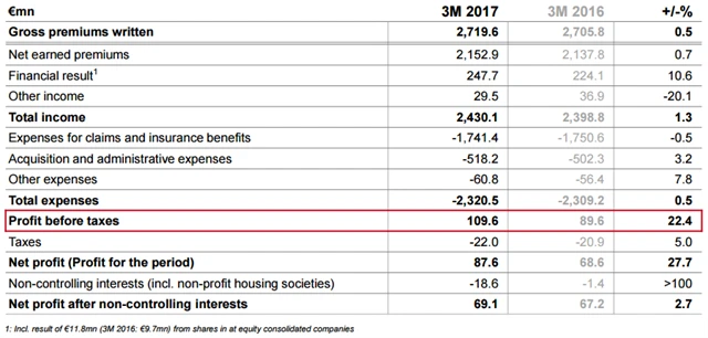 Pojišťovnická skupina Vienna Insurance Group vykázala za první čtvrtletí letošního roku čistý zisk 69,1 milionu eur při hrubém předepsaném pojistném 2,72 miliardy eur. Oba výsledky jsou meziročně mírně lepší, čistý zisk stoupl o 2,7 %, objem hrubého předepsaného pojistného se zvýšil o 0,5 %.