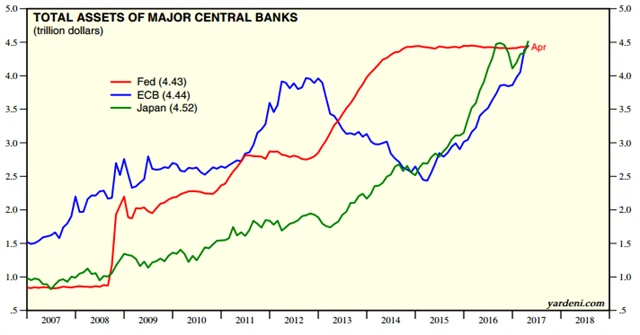 Kvantitativní uvolňování americké centrální banky nafouklo její bilanci z přibližně 900 miliard dolarů v roce 2008 na zhruba 4,5 bilionu dolarů. ECB a Bank of Japan na tom nejsou o mnoho lépe. Bilanci ECB navýšilo kvantitativní uvolňování ze dvou bilionů eur zatím na asi 4,1 bilionu eur a bilance japonské centrální banky dosud narostla ze 107 bilionů jenů na bezmála 500 bilionů jenů. Pokud se hodnota bilancí těchto tří centrálních bank sečte, vyjde děsivá částka kolem 13 bilionů dolarů. To je více než hodnota HDP Číny nebo celé eurozóny. A to ECB a Bank of Japan s nákupy ještě neskončily.