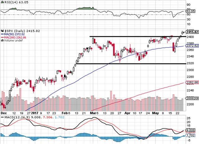 "Index S&P 500 v úterý otestoval rezistenci na 2 400 a od středy uzavírá nad ní. Ještě by měl tuto hladinu otestovat shora a uzavřít cenový odskok mezi středeční a čtvrteční svíčkou, abychom mohli metu 2 400 označit za nový support. Propad ze středy 17. května byl rychle zapomenut a situace hraje do karet dlouhodobým obchodníkům. Pokud se psychologicky významná hladina 2 400 opravdu změní na support, dalším cílem pravděpodobně bude kulatých 2 450. Případným poklesem pod 2 400 by se index vrátil do dlouhodobého rozpětí. Pokud by se dostal pod 50denní klouzavý průměr k supportu na 2 350, byl by to podle mě silný varovný signál. Ale blíží se prázdniny, v Británii se nekoná referendum o brexitu, ale 'jen' parlamentní volby, a proto by letní bezstarostnost mohla pokračovat," napsal v pravidelném technickém komentáři pro Investiční web opční obchodník Josef Košťál.