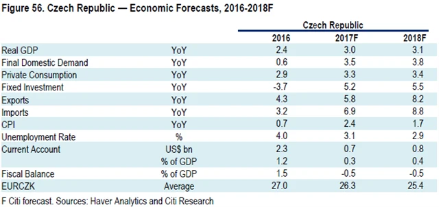 Zlepšili jsme výhled růstu české ekonomiky v letošním roce o 0,2 procentního bodu na 3 % a na 3,1 % v roce 2018. Lehce jsme ale snížili odhad růstu spotřebitelských cen kvůli přísnější měnové politice a menšímu příspěvku segmentu potravin.