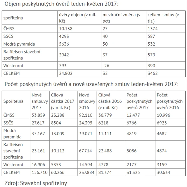 Stavební spořitelny poskytly letos do konce května úvěry za 24,8 miliardy korun, což je meziroční růst o zhruba třetinu. Počet nových smluv naopak klesl meziročně o třetinu na 156 710. Vyplývá to z výsledků stavebních spořitelen, které má ČTK k dispozici.