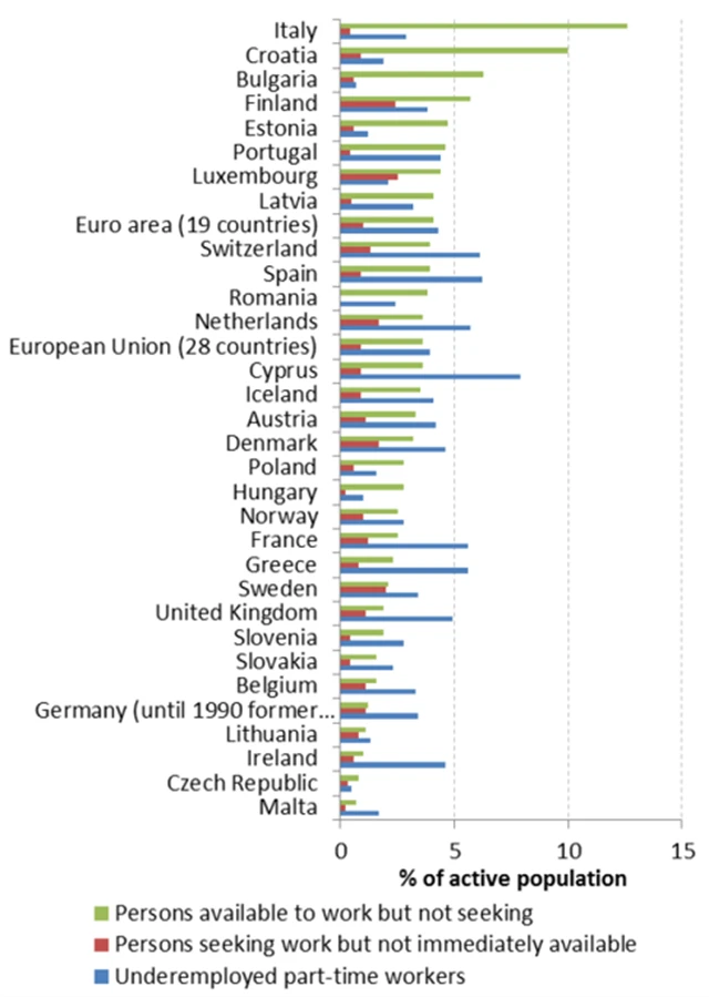 Jako možný důvod ECB uvedla, že vedle lidí vyhovujících definici nezaměstnanosti se na trhu práce nebo v jeho "sousedství" pohybuje také mnoho lidí, kteří tuto definici splňují jen částečně. Jsou to ti, kdo práci nehledají, nemohou do ní hned nastoupit, případně již pracují, ale na kratší úvazek, než by chtěli. Podle údajů Eurostatu bylo v roce 2016 v těchto třech kategoriích "téměř nezaměstnanosti" 9,4 % lidí ve věku 15-74 let.