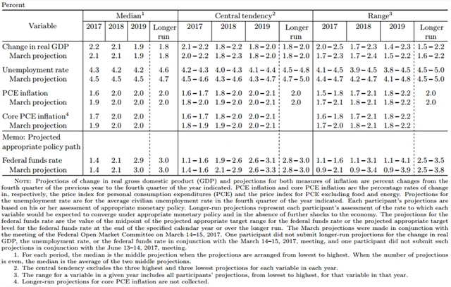 Hrubý domácí produkt Spojených států letos podle Fedu stoupne o 2,2 % (březnová prognóza: 2,1 %). Výhled expanze HDP pro roky 2018 a 2019 zůstal proti březnu beze změny (2018: 2,1 %, 2019: 1,9 %). Celková míra nezaměstnanosti letos podle Fedu bude v USA 4,3 % (březnová prognóza: 4,5 %), v letech 2018 a 2019 by se měla držet na úrovni 4,2 % (březnová prognóza: 4,5 %).