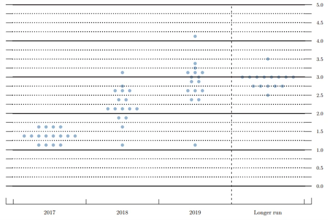 Fed - výhled vývoje základní úrokové sazby (červen 2017)