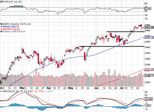 "Denní graf indexu S&P 500 je stále v býčím nastavení. Ve čtvrtek se přiblížil k podpoře v zóně 2 450 až 2 460, další support na 2 420 až 2 430 je ještě zesílen 50denním klouzavým průměrem. Nejbližší rezistence by mohla být na kulatých 2 500," napsal v pravidelném technickém komentáři pro Investiční web opční obchodník Josef Košťál. "Korekce se zdá být v nedohlednu, od poloviny srpna ale bývají trhy volatilnější, jako kdyby chtěly dohánět prázdninové nicnedělání. Uvidíme letos. Výsledková sezóna pokračuje na plné obrátky. Firemní čísla jsou většinou nad očekávání dobrá, ačkoli v týdnu nepříjemně překvapily například Amazon nebo ExxonMobil. V následujícím týdnu je na řadě mimo jiné Apple, který svou vahou může ovlivnit kondici celých indexů."