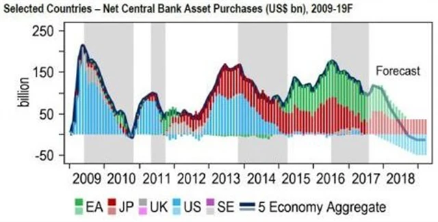 Analytici z Bank of America zdůrazňují, že pokud se bude měnová politika velkých světových centrálních bank vyvíjet v příštích měsících tak, jak se čeká, dostanou se finanční trhy a světová ekonomika do kritického bodu ve třetím čtvrtletí 2018. V tu chvíli totiž bude tempo rozpouštění bilance centrální banky USA vyšší než tempo skupování aktiv ze strany zbylých velkých centrálních bank rozvinutého světa.