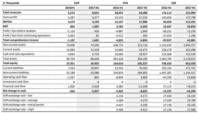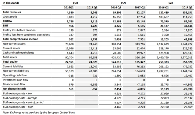 Na úrovni zisku EBIT firma vykázala čtvrtletní výsledek 1,22 milionu eur po 966 tisících eur loni. Zisk před zdaněním společnost navýšila ze 199 tisíc eur na 675 tisíc eur. Zisk po zdanění firmě stoupl z 347 tisíc eur na 394 tisíc eur.
