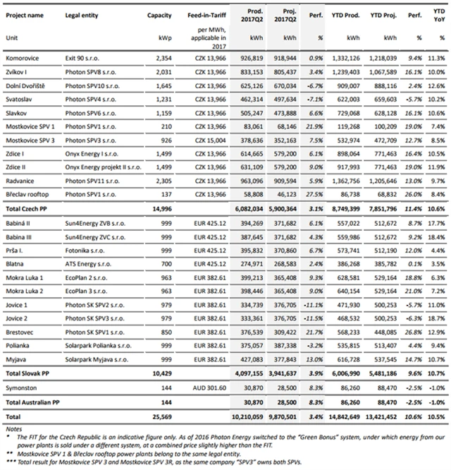 Výroba elektřiny v elektrárnách Photon Energy (2Q2017)