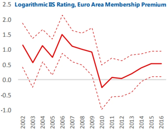 Nutno předeslat, že jde o hodnocení samotného členství, tedy po očištění o všechny fundamenty, jako jsou kvalita veřejných financí, saldo platební bilance, HDP na obyvatele a další. Jako měřítko názorů investorů je použit International Investor Country Credit Rating Risk Index. Vyjadřuje hodnotu, kterou investoři spatřují v samotném členství v eurozóně (jakýsi "EZ bonus").