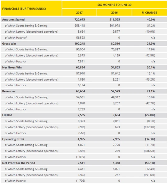 Objem přijatých sázek v segmentu on-line hazardních her k celkovému výsledku skupiny přispěl 87 miliony eur a společnost Hattrick Sports Group celkový výsledek skupiny podpořila 56 miliony eur.