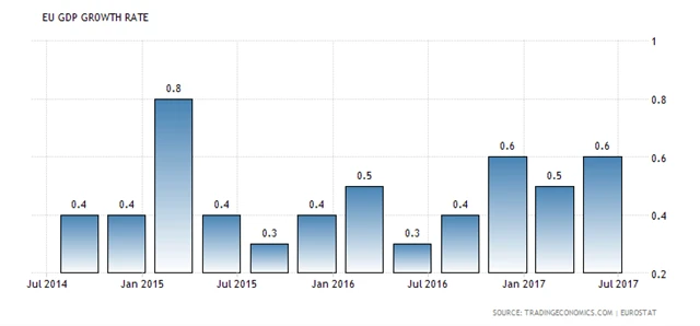 Růst ekonomiky eurozóny ve druhém čtvrtletí byl potvrzen na mezikvartálních 0,6 %, meziročně byl růst oproti předchozímu odhadu revidován výše, konkrétně z 2,2 % na 2,3 %.