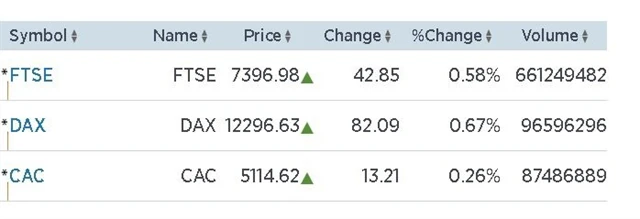 Celoevropský akciový index STOXX Europe 600 uzavřel seanci se ziskem 0,27 % a většina jeho sektorů byla v černých číslech. Hlavní index londýnské burzy FTSE 100 si polepšil o 0,58 %, německý DAX o 0,67 % a francouzský CAC 40 posílil o 0,25 %.
