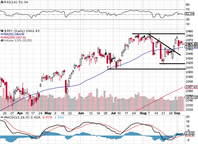"Geopolitické tenze a hurikánová sezóna na jihovýchodě USA na jedné straně, na té druhé právě s přírodními katastrofami spojené posunutí dluhového stropu na prosinec. Obchodníci mají na co reagovat, akcie v Americe ale zůstávají bezpečně mezi důležitými cenovými úrovněmi. Index S&P 500 ve zkráceném obchodním týdnu odepsal 0,61 % a od rezistence se přesunul lehce nad 50denní klouzavý průměr. Tím, že rezistenci nepřekonal a zůstává v obchodním rozpětí, nastavení grafu se nemění. Nejdůležitější support je stále na 2 400 až 2 420, na opačné straně je rezistence v zóně 2 480 až 2 500," napsal v pravidelném technickém komentáři k dění na americkém akciovém trhu opční obchodník Josef Košťál.