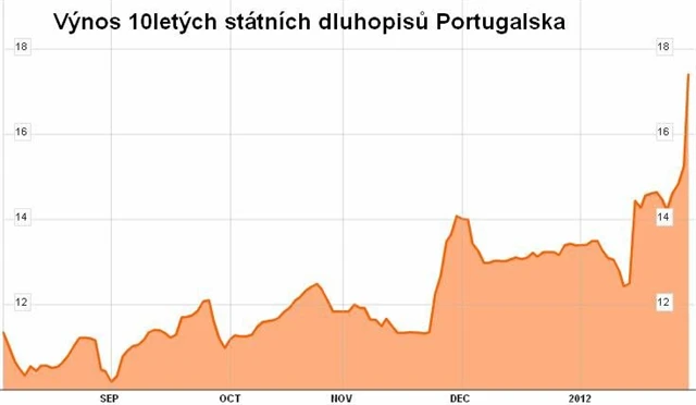 Evropská krize se v obměnách vrací jako bumerang. Zhruba po roční pauze opět dopadá i na slabší ze dvou zemí na Pyrenejském poloostrově - Portugalsko. To sice není pod takovým tlakem novinářů, politiků a mezinárodních institucí jako Řecko, ale výnosy portugalského desetiletého výnosu i tak včera vystřelily vzhůru o více než 200 bps a překročily 17 %. Problémy Portugalců nejsou tak hluboké jako ty řecké, i tak jsou však druzí v řadě na osekání dluhů.
