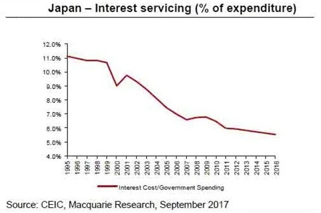 Shvets doplňuje, že důležitým faktorem je samotná centrální banka. Ta svými agresivními nákupy aktiv cíleně snižuje náklady na kapitál. V posledních letech se tento způsob snižování vládních výdajů stal oblíbeným a všeobecně akceptovaným nástrojem a Japonsko z toho těží. Navzdory masivnímu nárůstu hrubého i čistého dluhového zatížení vlády se podíl státních výdajů určených na správu dluhu v posledním desetiletí významně snížil. Nyní je pod 5 % celkových výdajů.