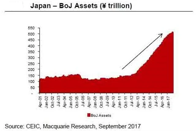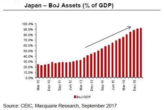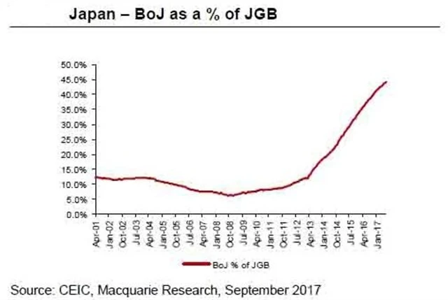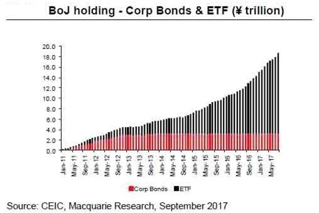 Banka navíc nenakupuje pouze státní dluhopisy, ale také firemní dluhopisy a je aktivní také na trhu s ETF, respektive na akciovém trhu. Má tak pod kontrolou až 75 % všech japonských ETF (což představuje ale jen 4 % akcií) a až 15 % firemních dluhopisů.
