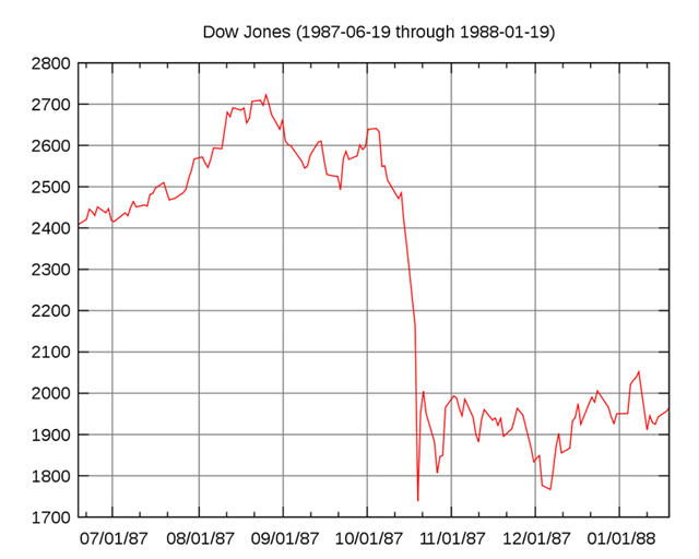 19. října 1987 se na Newyorské burze cenných papírů (NYSE) odehrál propad známý jako "černé pondělí". Jednalo se o největší otřes na světových burzách po druhé světové válce. V osudný den oslabil hlavní index newyorské burzy Dow Jones Industrial Average o 508 bodů (22,3 %) a příští dny následoval propad také na evropských burzách. Důvodem byly vysoké ceny akcií, vysoká likvidita a krize v Perském zálivu.