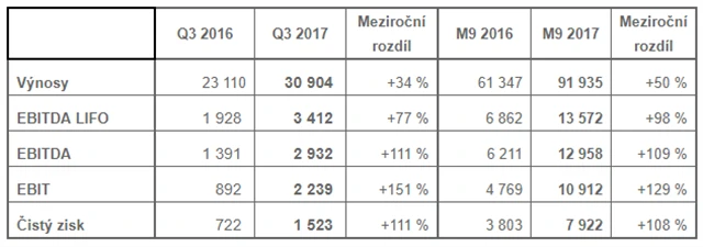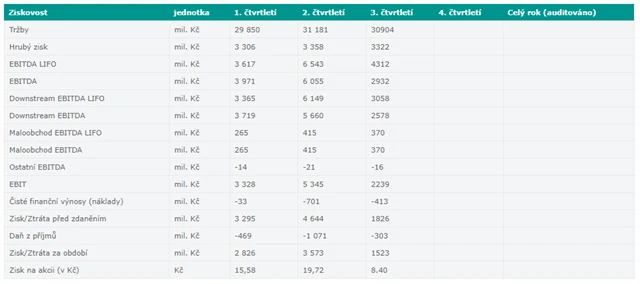 Nárůst čistého zisku o 111 % na 1,52 miliardy korun překonal i odhady analytiků, kteří očekávali výsledek 1,3-1,4 miliardy korun. Objem zpracované ropy ve třetím čtvrtletí meziročně stoupl o 104 % na 2,1 milionu tun při rekordním využití rafinérských výrobních kapacit na úrovni 97 %.