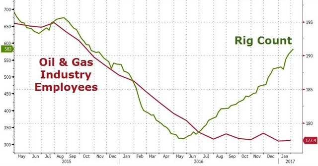 V grafu je počet aktivních souprav na těžbu ropy a zemního plynu v USA a počet pracovníků v těžebním odvětví. Zatímco počet pracovníků před pár lety klesal v podstatě ruku v ruce s počtem aktivních vrtů (a propadem cen ropy), po renesanci těžby počty zaměstnaných lidí zůstaly na snížené úrovni.