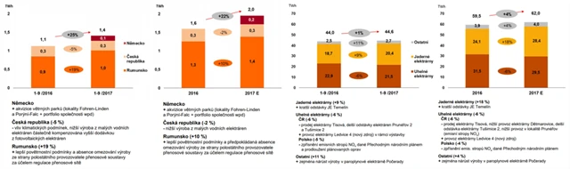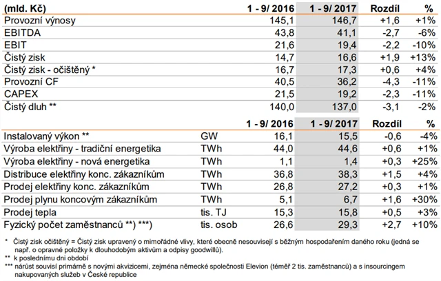 Provozní výnosy společnosti dosáhly v prvních devíti měsících roku 146,7 miliardy Kč, meziročně tak vzrostly o procento, přičemž výroba elektřiny z tradičních zdrojů meziročně stoupla o procento na 44,6 TWh. Výroba elektřiny z větrných, fotovoltaických a malých vodních elektráren vzrostla o 25 %, především díky nárůstu výroby ve větrných parcích v Rumunsku a díky akvizicím větrných zdrojů v Německu na konci roku 2016. Skupině ČEZ se nadále daří také na trhu prodeje zemního plynu koncovým zákazníkům, objem prodeje meziročně vzrostl o 30 %.