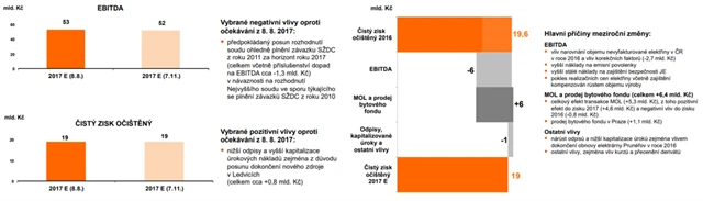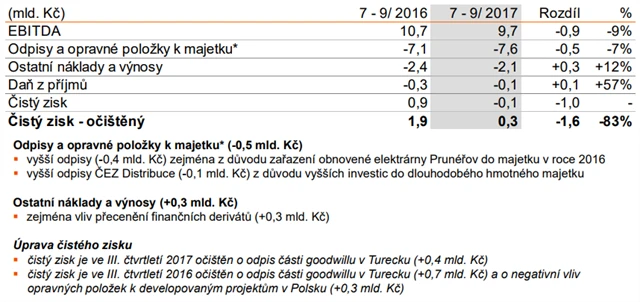 "Výsledky hospodaření za třetí čtvrtletí zaostaly za očekáváními, a to zejména na úrovni provozní a čisté ziskovosti. Na vývoji provozního výsledku EBITDA se negativně podepsaly nižší realizační ceny vyrobené elektřiny a vyšší náklady na emisní povolenky, naopak pozitivně působila struktura výroby díky vyššímu využití jaderných elektráren. Čistý zisk ovlivnily vyšší odpisy kvůli zařazení elektrárny Prunéřov do majetku společnosti. Přecenění finančních derivátů působilo pozitivně. ČEZ také odepsal část goodwillu v Turecku (0,4 miliardy Kč)," uvedl analytik z Komerční banky Miroslav Frayer.