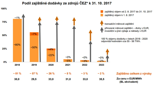 ČEZ měl pro příští rok k 31. říjnu zajištěný odbyt pro 81 % předpokládané výroby elektřiny za průměrnou cenu 30 EUR/MWh. Pro rok 2019 má již ČEZ předprodáno 57 % předpokládané výroby za průměrnou cenu 29,50 EUR/MWh a pro rok 2020 má nasmlouvaný prodej asi 26 % výroby za 33 EUR/MWh. Pro další roky dosahuje objem nasmlouvaných prodejů maximálně 5 % předpokládané výroby při ceně 31-35,50 EUR/MWh.